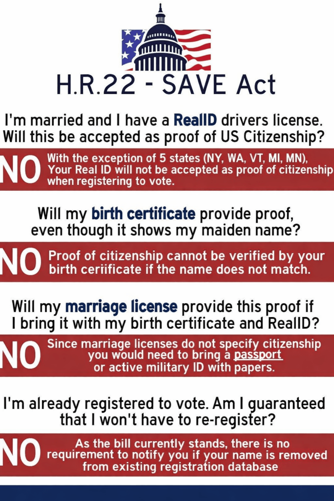 Based on these false claims, he is urging Congress to pass the SAVE Act (Safeguard American Voter Eligibility) which would: